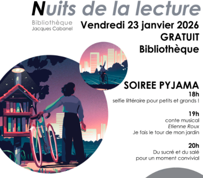Au programme : 18h/19h : viens te faire prendre en photo version Bookface ! C'est le selfie littéraire pour petits et grands 19h : conte musical (45 min) "je fais le tour de mon jardin" 20h : chocolat chaud, bonbons...pour un moment convivial. Ce conte musical est une amorce à l'écoute active à la découverte du monde du bruit. Étienne Roux, musicien comédien, raconte en s'amusiquant des histoires autour des saisons, de la nature. Il vous invite à venir explorer les sons, à bruiter, pour l'aider à illustrer son histoire sonore et musicale ! Évènement : Nuits de la Lecture