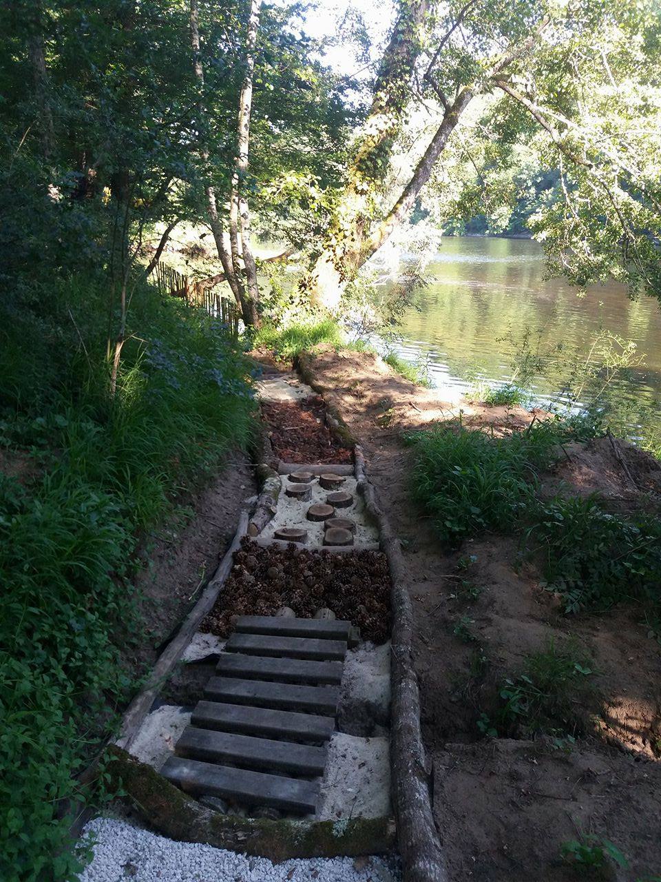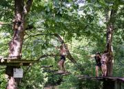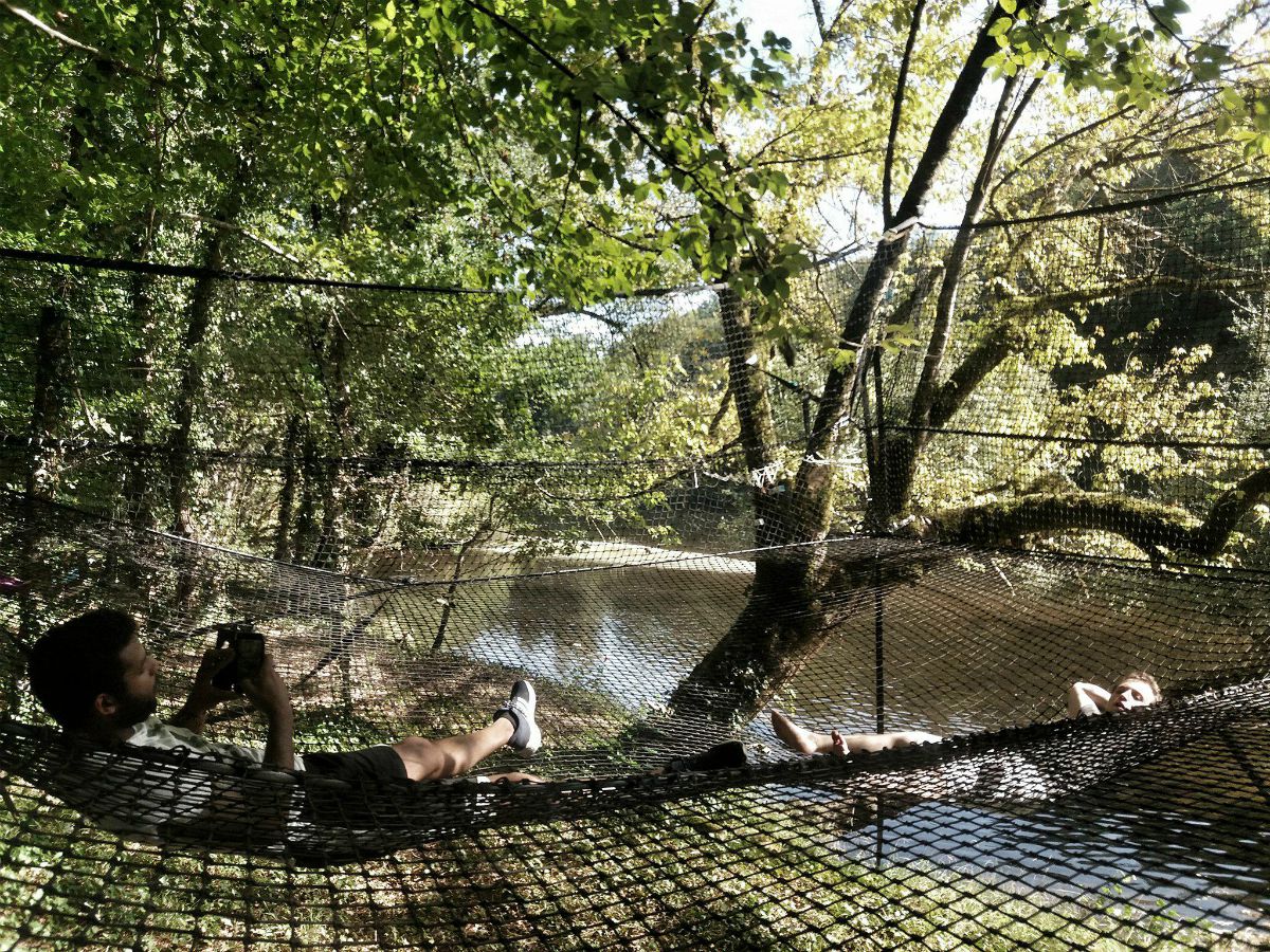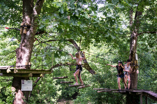 Plusieurs ponts de singe et des tyroliennes passent au-dessus de la Dordogne : sensations garanties ! Les plus jeunes (à partir de 3 ans) ne sont pas oubliés, ils ont de quoi s’amuser sur les tyroliennes et les passerelles spéciales « pitchounets ». Une fois leur parcours réalisé, petits et grands se retrouvent pour une promenade sur le thème de la faune et la flore typiques de la rivière et du Périgord Noir, ou même une nuit dans les arbres, sous une tente transparente. |