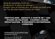 Tarifs : Tarif de base : à partir de 14,00 € (Junior à partir de 7 ans (1m24) session de 8 min) Tarif de base : à partir de 18,00 € (Pilotes tous niveaux à partir de 14 ans (1m40) session de 10 min) Tarif de base : à partir de 42,00 € (Pilotes expérimentés à partir de 16 ans (1m40) session de 10 min) Tarif de base : à partir de 25,00 € (Kart loisir Bi-place, pilote majeur obligatoirement, session de 8 min)