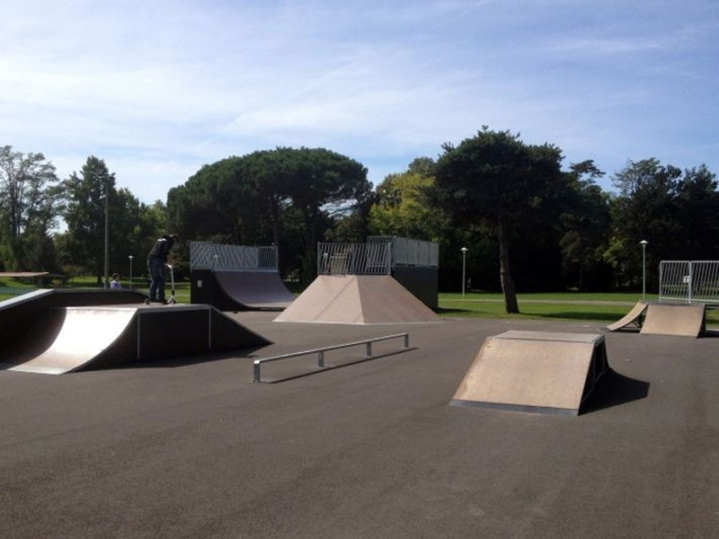 Le skate park de Biganos est composé de modules en bois parmi lesquels une mini rampe, un module central avec funbox et ledge montée plat descente et demi pyra, des lanceurs, un petit rail plat carré, des curbs...