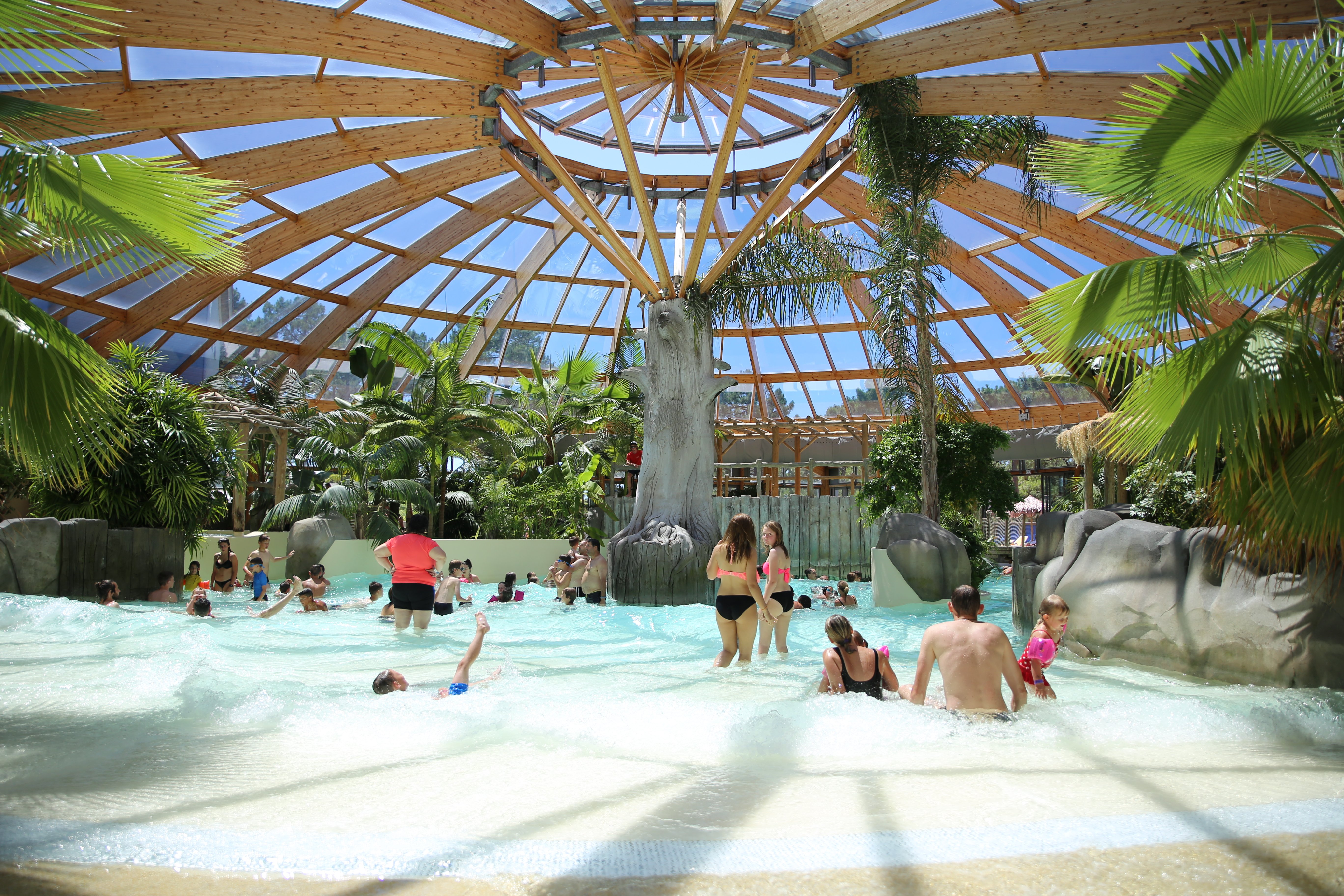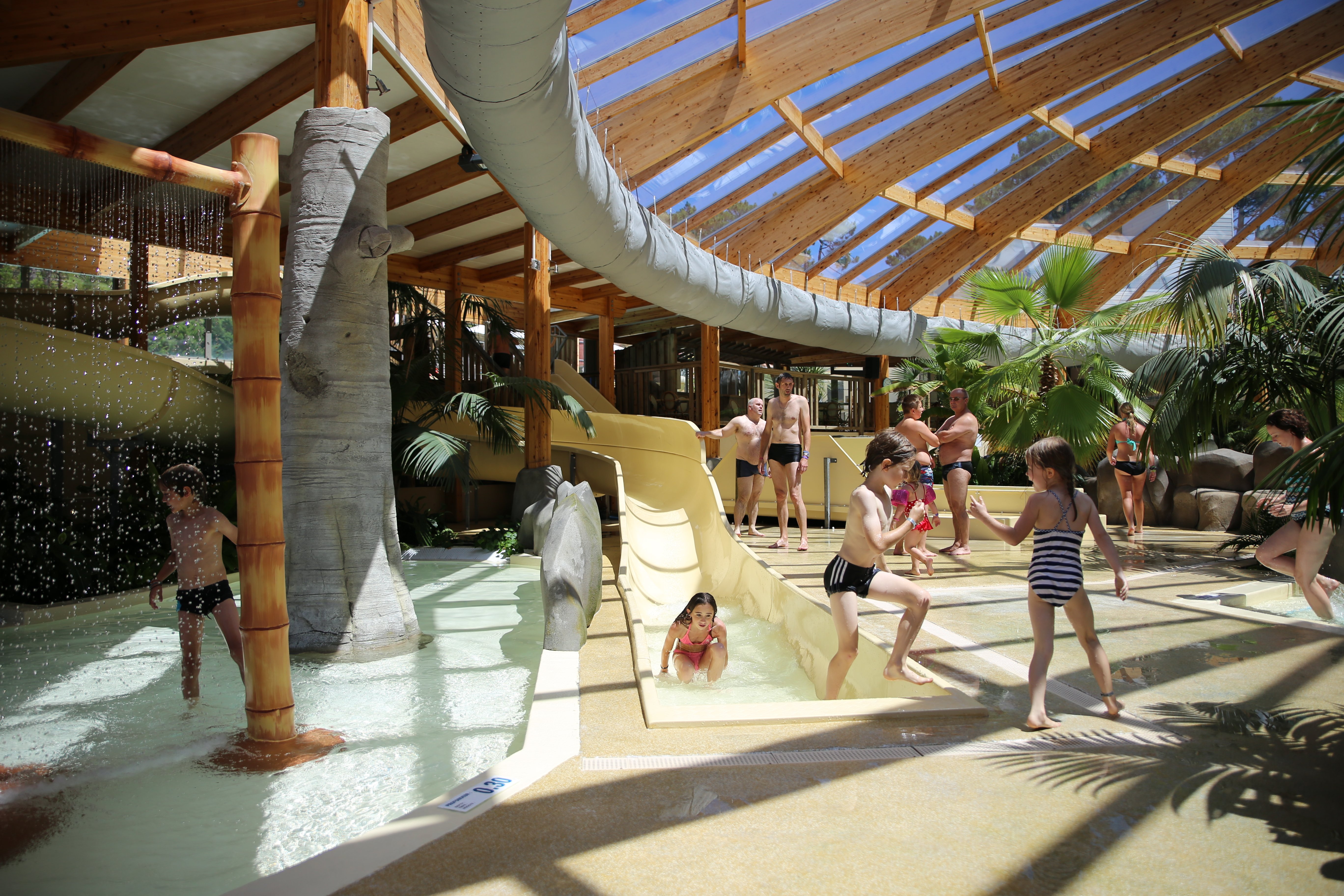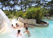 Surplombant le Camping Airotel de l'Océan, au cœur d'un domaine boisé de 9,5 ha, le parc aquatique Aqualiday vous accueille dans son ambiance tropicale.
