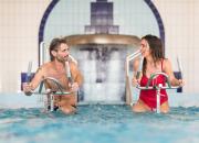 Détente aquatique en piscines de loisirs (eau chaude à 32° en moyenne) piscine intérieure climatisée et piscine extérieure en eau chauffée. Bains californiens, cascades, cols de cygne, geysers, rampes de massage, nage à contre-courant, plages, relax, banquettes bouillonnantes, bébés nageurs, aquagym, aquabyke, aquaphobie, leçons de natation.