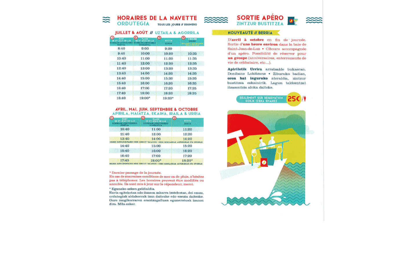 Traversée de la baie : embarquement à la digue aux chevaux, au port de Larraldenia, au port de Socoa et au port de pêche de St-Jean-de-Luz.