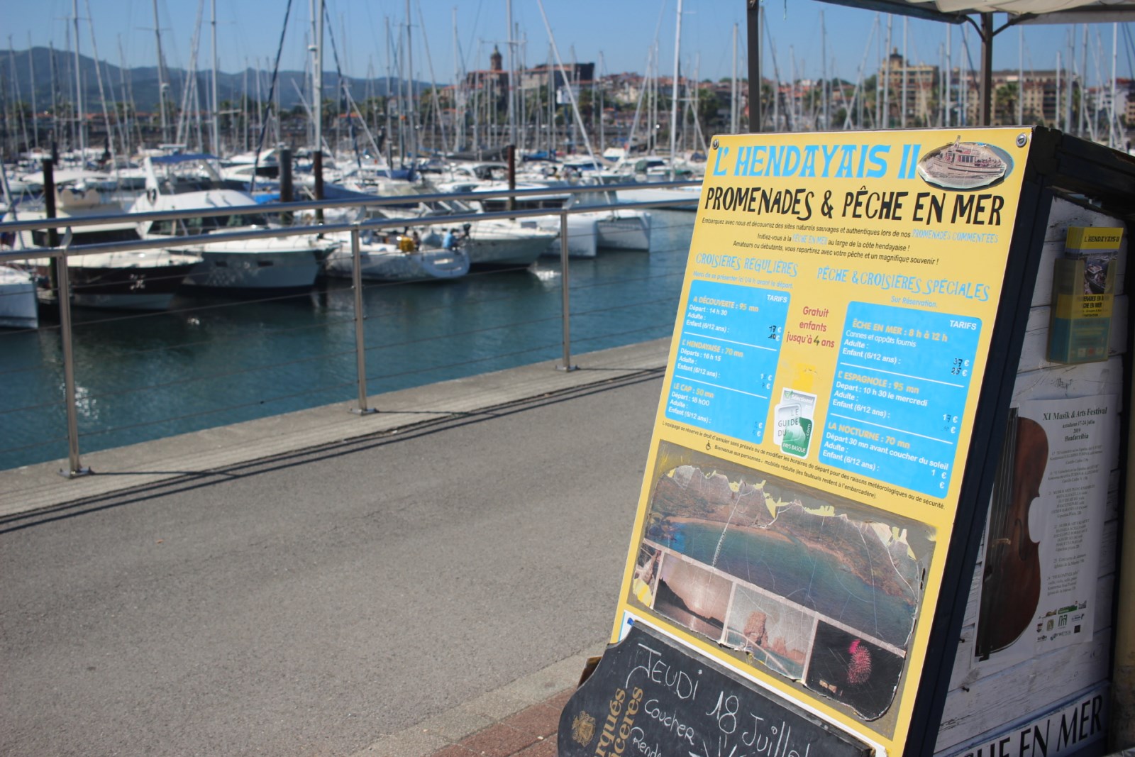 Tarifs enfants de 6 à 12 ans - Gratuit jusqu'à 5 ans CROISIERE DECOUVERTE 95 mn - départ 14h30 Navigation la plus complète, côte française et espagnole Réservation conseillée en juillet - août CROISIERE HENDAYAISE 70mn - départ 16h15 Navigation côte française CROISIERE DU CAP 50mn - départ 18h Navigation côte espagnole CROISIERE ESPAGNOLE 95mn - départ 10h30 le mercredi sur réservation - Navigation la plus complète, côte Espagnole CROISIERE NOCTURNE 70mn sur réservation Départ 30mn avant le coucher du soleil Profitez de moments magiques au crépuscule ! SPECIAL FEUX D'ARTIFICE DU 14 JUILLET A HENDAYE sur réservation GROUPES - SORTIES SCOLAIRES ET PRIVATISATION |