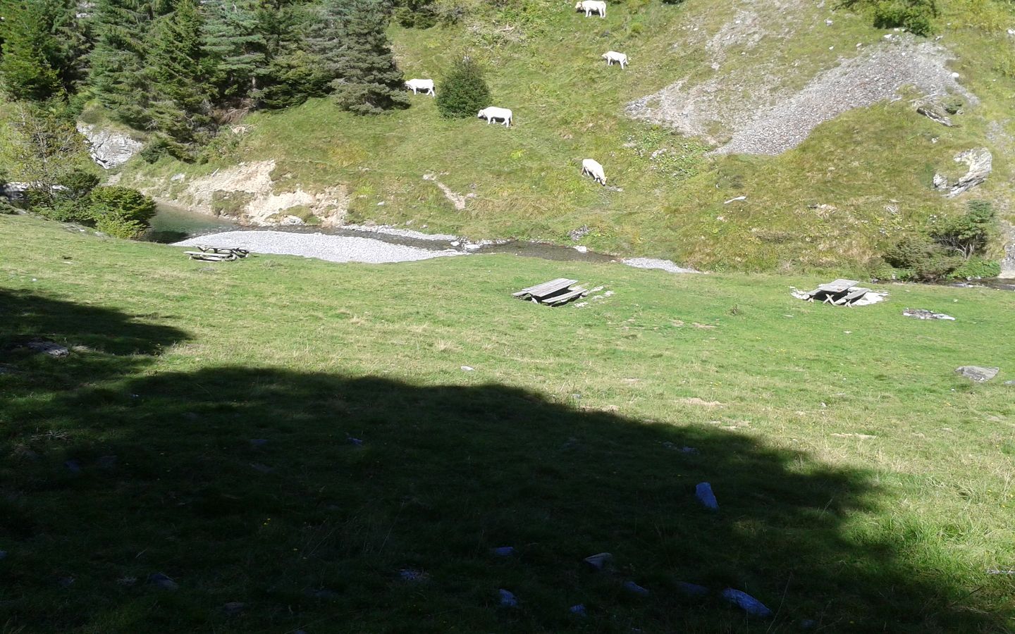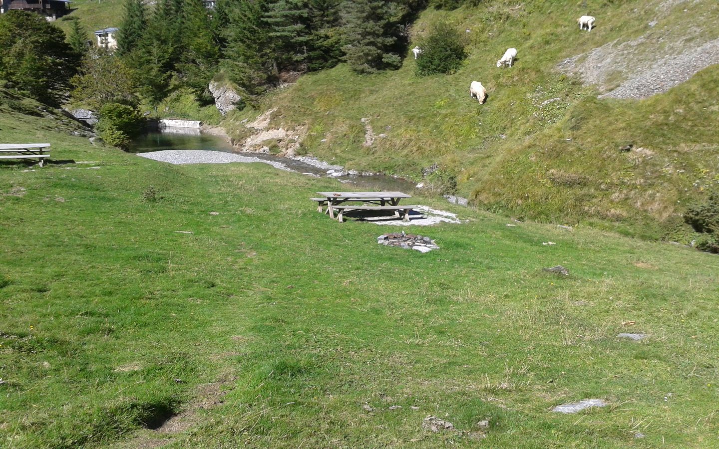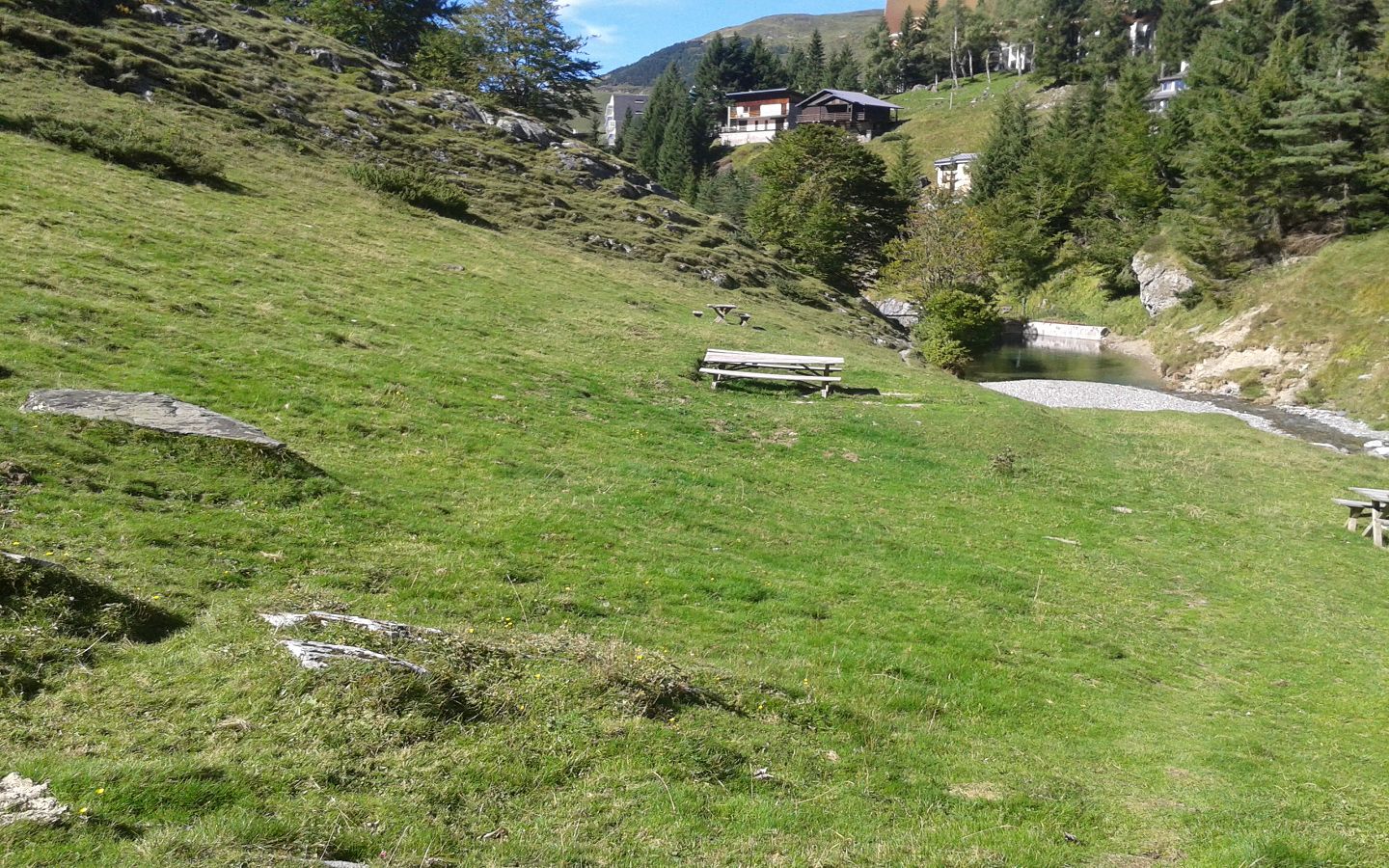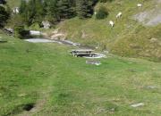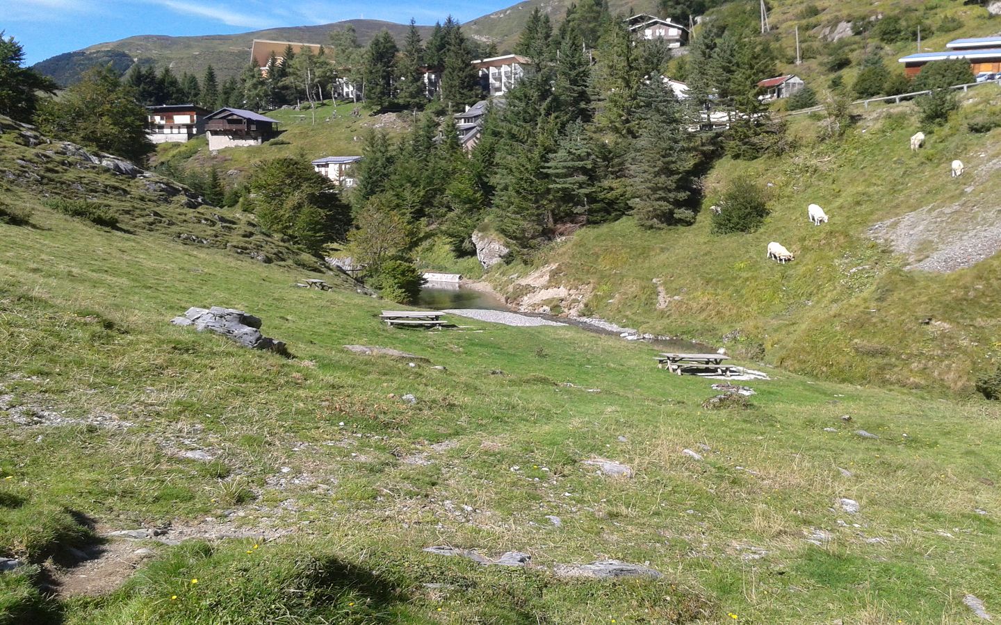 A 300 m de la Maison de Gourette, en direction du GR10 'lac d'Anglas' et du parcours santé, 3 tables et bancs en bois sont installés en contre haut d'un petit cours d'eau. L'aire n'est pas ombragée. Il faut revenir sur vos pas pour trouver les containers à poubelles.