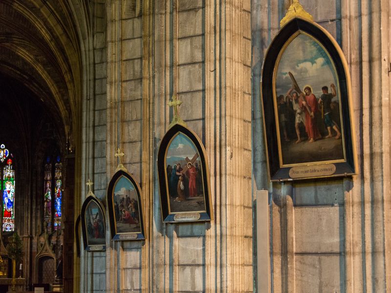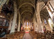 Remaniée au fil des siècles, elle prendra son aspect actuel au XIXème siècle. C'est un édifice gothique qui conserve des reliques comme une Sainte-Epine aux côtés de la Sainte-Croix! L'un des retables est une oeuvre néo-gothique, remarquable travail d'orfèvrerie du XIXème siècle. |