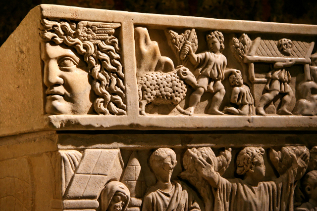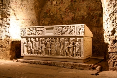 De l’extérieur, l’église se distingue par sa tour carrée, son clocher porche abritant un portail sculpté et sa façade en pierres et en briques. Après être entré par le portail occidental et avoir traversé la nef et le transept, descendez dans la crypte, l’une des plus vastes d’Europe. S’y trouve le sarcophage qui contenait les reliques de Sainte-Quitterie ; en marbre blanc, cette véritable œuvre d’art datée de la fin du IVème siècle présente des scènes sculptées où se mêlent style païen et thèmes chrétiens. |