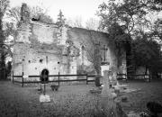 Venant de Sarran en direction de la départementale 35, en bordure du chemin vicinal n°1, l'église en ruine est peu à peu envahie par le lierre. Comme les 6 autres églises du village de Parleboscq, elle a connu au fil des siècles les tragédies des guerres. Au 14e siècle, le chevet à pans et la nef sont construits. Au 16ème siècle, la tour-clocher carrée à la base et octogonale à l’étage est élevée, avec sa tourelle d’escalier. L’édifice est entièrement bâti de briques avec chaînages d'angles en pierre de taille. A la base de la tour, s’ouvre le portail avec bases fasciculées, arc en anse de panier et accolades, caractéristique du gothique flamboyant.