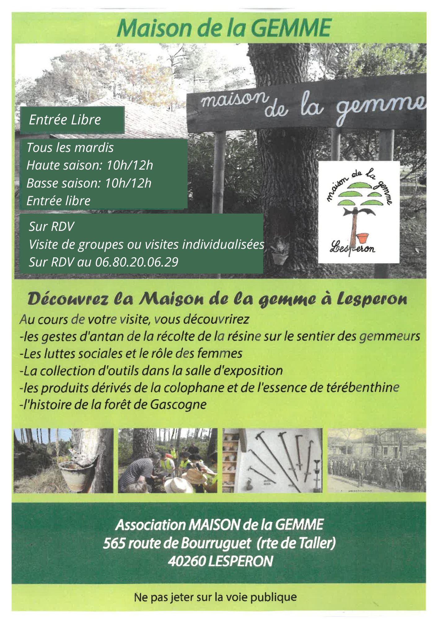 C’est un lieu de mémoire retraçant l’activité économique qui a structuré la vie et le lien social de la commune et de tout le massif Aquitain en général : le gemmage, sa pratique, son histoire, les luttes sociales des résiniers, son déclin et son espoir de renaissance. L’équipe de bénévoles vous accueille autour de son ancienne bergerie, chaque mardi matin de 10 h à 12 h. Mais vous pouvez aussi réserver votre visite, les ateliers d’animation (démonstration de gemmage, histoire et gestion de la forêt, utilisation actuelle de la gemme). , |