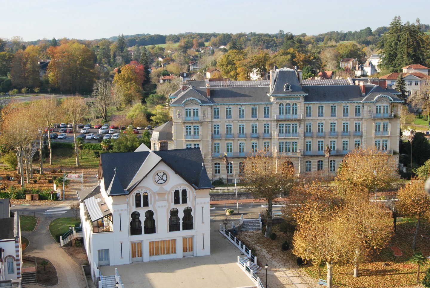 C'est en 1893 qu'a été construit l'Hôtel du Parc par Pierre Saint Guily et pour le compte de Gabriel Graner dont les initiales figurent encore sur la façade. Pour l'époque, c'est un vrai Palace, d'une architecture hardie et d'un confort rare. Il dresse ses 4 étages dans un parc de 2 hectares, face au Jardin Public et à l'Etablissement Thermal. Son vaste hall de 54 m de long et 18 m de large, éclairé par une verrière en forme de nef renversée à 27 m de hauteur, permet d'admirer les galeries à l'italienne qui courent à chaque étage. De nombreuses célébrités y ont résidé ou y séjournent encore en toute quiétude. |