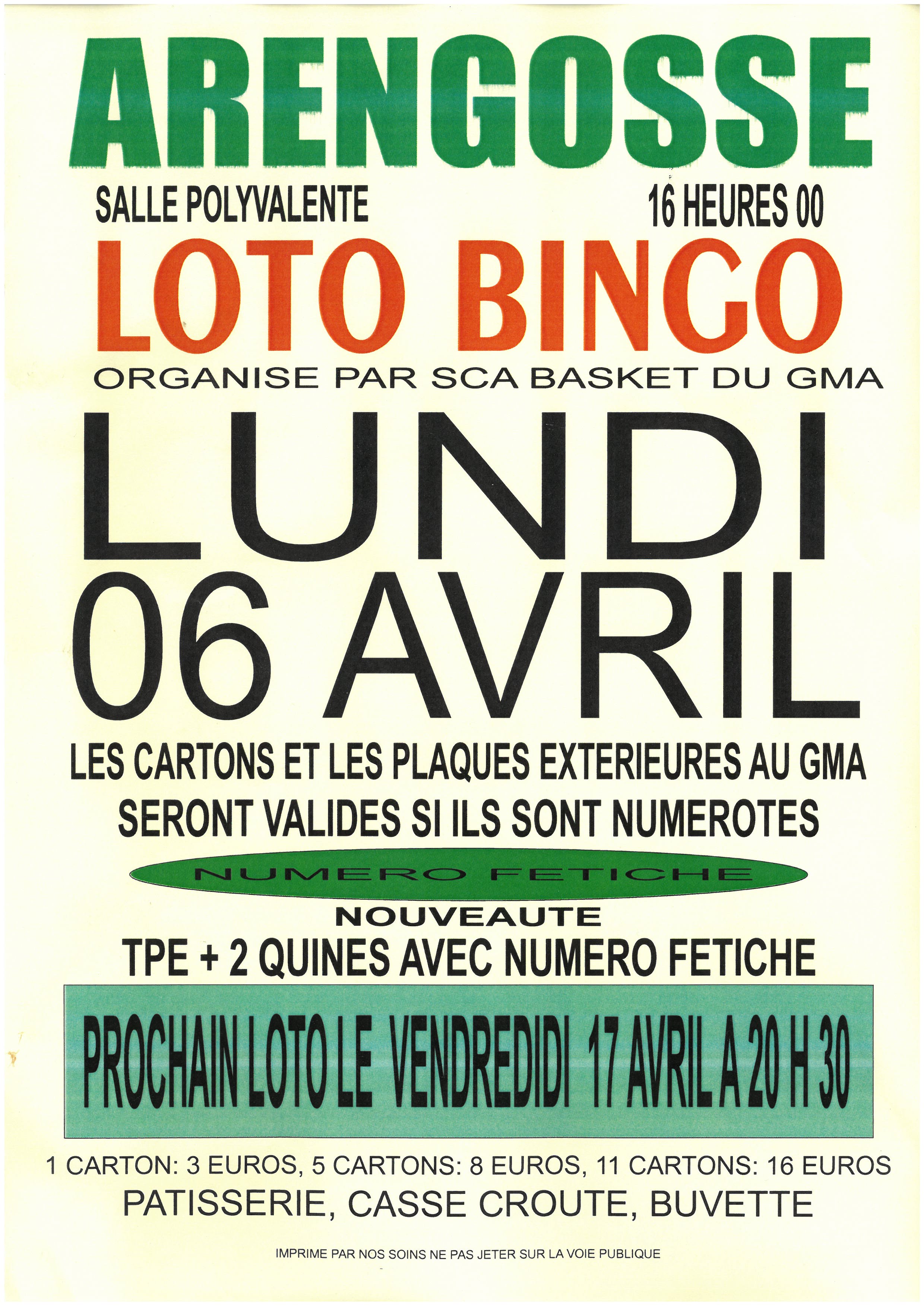 | Loto Bingo du SCA Basket Le lundi 6 avril 2026 40110 ARENGOSSE Tél : +33 5 58 51 72 97