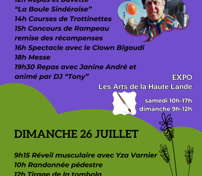 10h -12h :Petits jeux pour tous 12h Repas et buvette de "La Boule Sindéroise" 14h Courses de trottinettes 15h Concours de Rampeau - Remise des récompenses 16h Spectacle avec le clown Bigoudi 18h Messe 19h30 Repas avec Janine André et animé par DJ "Tony": Menu adulte : non défini à ce jour Menu enfant : non défini à ce jour Dimanche 9h15 Réveil musculaire avec Yza Varnier 10h Randonnée pédestre 12h Tirage de la tombola Pique-Nique sorti du sac 14h30 Concours de pétanque EXPOSITIONS / Les Arts de la Haute Lande Samedi : de 10h à 17h Dimanche : de 9h à 12h |