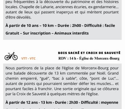 Grand chemin empierré, "gué", "bac à sables", côte," pont de Luc"... autant de points qui pourraient sembler défier les muscles .... et pourtant faciles à franchir. Une sortie originale qui se clôturera par la croix de sauveté à quelques mètres de l'église. A partir de 12 ans - 13 km - Durée 2h30 - Difficulté : Moyenne Matériels non fournis - Possibilité location Tandem - Casque, gilet, eau conseillés Gratuit - Animaux non acceptés - Gratuit