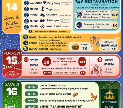 Jeudi 14 mai : Grande journée sportive avec marche (9h), ping pong (10h), yoga (10h30), danse country (11h), concours de pétanque (15h), lasergame (15h30). Remise des clés à 19h. Restauration le midi et le soir, bodéga. Vendredi 15 Mai à 19h30 : Soirée Guinguette - Les jeunes de la Classe réveilleront vos papilles avec un succulent repas (sur réservation). Bodéga pour danser toute la nuit. Samedi 16 Mai : Spectacle interactif de cirque, jonglerie et magie avec Joe le Camelot (15h) suivi d'un goûter. Bulles de savons géantes et balades à poney (16h). Soirée "à la bonne barquette (19h) animée par les Dalton's et le duo Say. Bodéga de la classe (22h30) et feu d'artifice en musique (23h). |