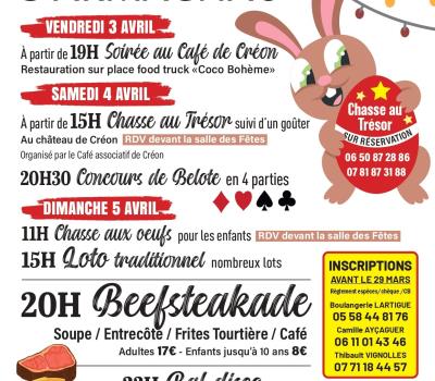 - Vendredi 3 : Soirée foodtruck "Coco Bohème" à partir de 19h. - Samedi 4 : Chasse au trésor pour les enfants (sur réservation) à partir de 15h suivi d'un goûter devant le Château de Créon, puis à 20h30 place au Concours de belote. - Dimanche 5 : Chasse aux oeufs pour les enfants à 11h devant la salle des fêtes, puis Loto traditionnel à 15h, suivi d'un repas Beefsteakade (sur réservation avant le 29 Mars) à 20h et d'un bal disco à 23h - Lundi 21 : Concours de Pêche avec lâcher de truites à 9h (inscription & déjeuner à partir de 8h30) Tarifs : Plein tarif : à partir de 17,00 € (Beefsteakade (Adulte)) Tarif réduit : à partir de 8,00 € (Beefsteakade (Enfant jusqu'à 10 ans)) |