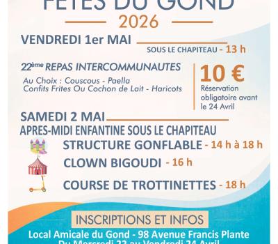 vendredi 1er mai : Repas inter-communautés 10 € ( inscription obligatoire du 22 au 24 avril de 15h à 18h au 68 av Francis Planté). Samedi 2 mai : 14 h à 18h structures gonflables. 16h spectacle avec le clown Bigoudi 18h : course de trottinettes. |