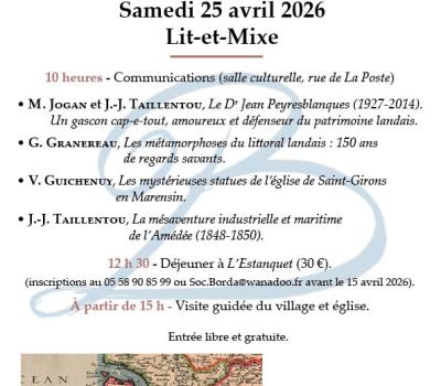 - Le Dr Jean Peyresblanques (1927-2014). Un gascon cap-e-tout, amoureux du patrimoine landais par M. Jogan et J.J. Taillentou - Les métamorphoses du littoral landais : 1520 ans de regards savants par G. Granereau - Les mystérieuses statues de l'église de Saint-Girons en Marensin par V. Guichenuy - La mésaventure industrielle et maritime de l'Amédée (1848-1850) par J.J. Taillentou 12h30 Déjeuner à l'Estanquet (30€, inscriptions au 05 58 92 85 99 avant le 15 avril) 15h visite guidée du village et église. Entrée libre et gratuite. |
