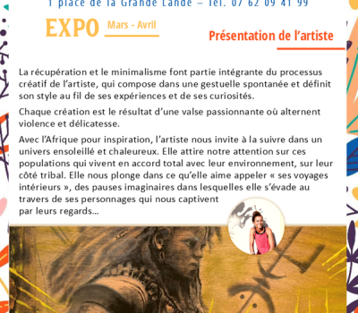 Connectée à la nature et à la création depuis toujours, Céline Blaid se plait à modeler la matière à transformer la terre en sculpture ou à peindre avec trois fois rien sur une toile. Son expression est si pure, qu’elle ne dépend pas d’un support ou d’un médium, c’est une question d’imagination et de sensations… La récupération et le minimalisme font partie intégrante du processus créatif de l’artiste. Malgré des études artistiques, cette amoureuse du partage picturale a découvert son style au fil de ses expériences et de ses curiosités. Son art est le fruit d’un besoin, une envie incontrôlable de communiquer au travers de la couleur et des formes, dans une harmonie qui rayonne par sa positivité. Gratuit