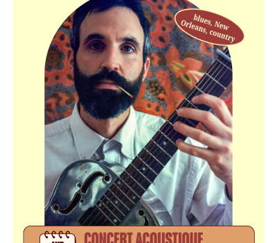 Blues and Country Soul Music Interprète compositeur multi instruments Humble et talentueux New-Orléans vibes Start 20h Pensez à réserver pour le dîner par téléphone ou directement sur le site Gratuit