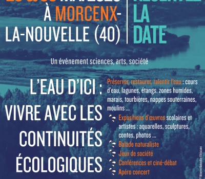 L'eau d'ici : Vivre avec les continuités écologiques Préserver, restaurer, ralentir l'eau : cours d'eau, lagunes, étangs, zones humides, marais, tourbières, nappes souterraines, moulins.. Expositions d'oeuvres scolaires et artistes : aquarelles, sculptures, contes, photos ... Balade naturaliste Jeux de societé Conférence et ciné-débat Apéro Concert Programme en cours de finalisation |