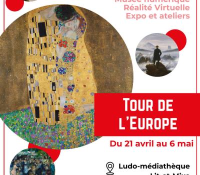Faites le tour de l'Europe en suivant les traces de ses œuvres les plus connues, les plus mystérieuses, ou les moins populaires. Artistes grecs, hollandais, espagnols ou italiens, de la Renaissance ou contemporains, un riche panorama s'offre à vous ! Casques de Réalité Virtuelle (dès 13 ans) : Plongez au cœur des œuvres de peintres européens et découvrez leur univers. Nombreux ateliers proposés sur inscription : - Mercredi 22 "Goûter à la découverte des œuvres" - Jeudi 23 "Apéro théâtral" - Samedi 25 Atelier "art en scène" - Mercredi 29 Atelier d'écriture - Samedi 2 Atelier "Peinture européenne" - Mercredi 5 "à la manière de Keith Haring" Gratuit. Gratuit