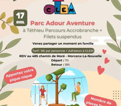 A Téthieu vous profiterez pleinement du parcours accrobranche et de ses filets suspendus. Tarif 9€ + Adhésion CLEM 10€ RDV au 485 chemin de Moré - Morcenx-la-Nouvelle Départ : 11h Retour : 18h N'oubliez pas : - votre pique-nique - et de RÉSERVER ! Attention, places limitées Réservation auprès d'Orane |