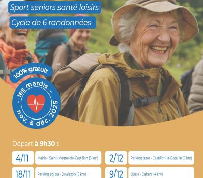 Le 4 novembre : rdv à la mairie de Saint-Magne-de-Castillon (3km) ; 18 novembre : parking de l'église de Doulezon (5 km) ; 25 novembre : château de Rauzan (3km) 4 décembre : parking de la gare de Castillon (6km) 11 décembre : quais de Cabara (4km) 18 décembre : parking de la mairie de Mouliets-etVillemartin (3km, suivi d'un chocolat chaud) |