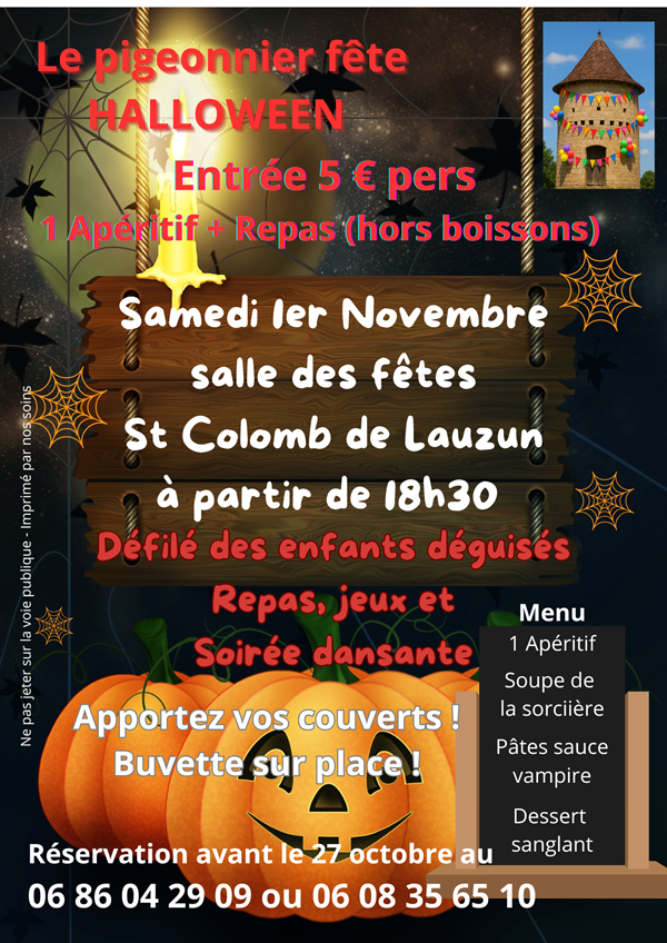 Soirée dansante Halloween Le samedi 1 novembre 2025 47410 SAINT-COLOMB-DE-LAUZUN Tél : +33 6 86 04 29 09 ou +33 6 08 35 65 10