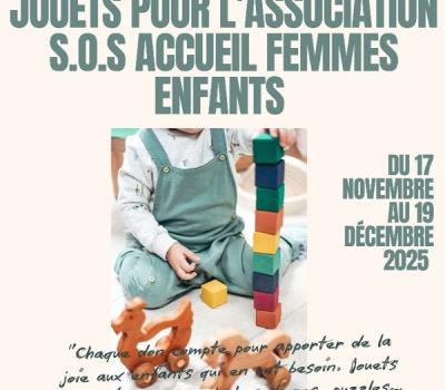 L'association Les Champs Fleuris organise une collecte de jouets en faveur de l'association S.O.S Accueil Femmes Enfants. Le dépôt se fait à la mairie le mercredi matin. Chaque don compte pour apporter de la joie aux enfants qui en ont besoin. Jouets acceptés : jeux, peluches, livres, puzzles en bon état. Merci pour votre générosité.