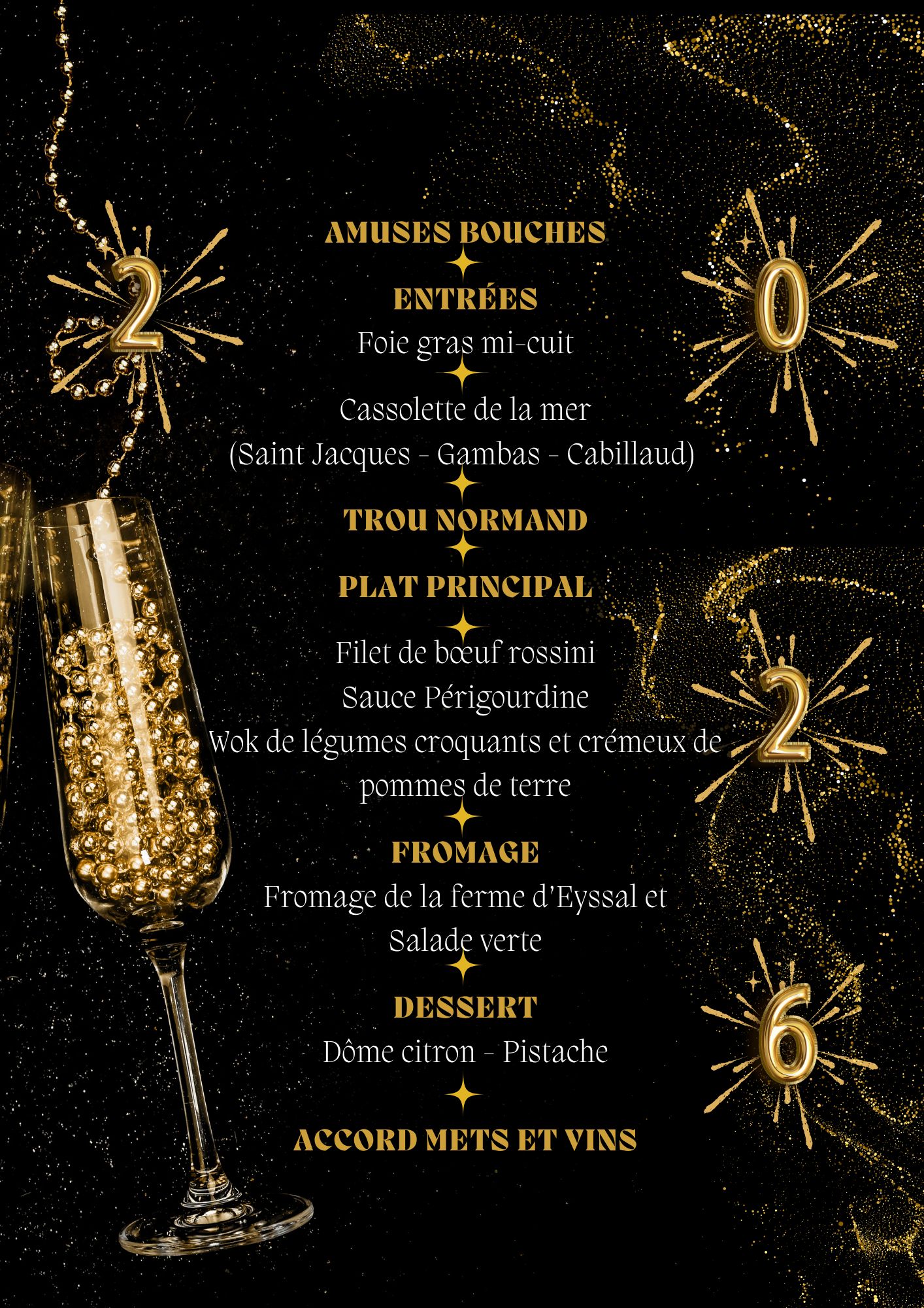 | Réveillon de la Saint-Sylvestre Le mercredi 31 décembre 2025 24150 LANQUAIS Tél : +33 6 62 19 06 71 ou +33 6 11 34 10 86