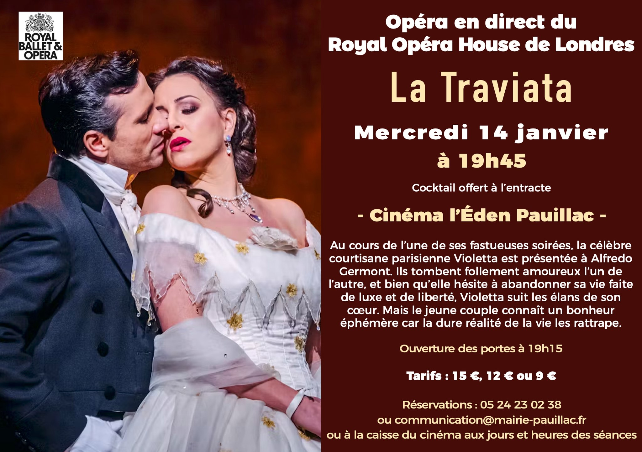 | Ciné opéra "La Traviata" Le mercredi 14 janvier 2026 33250 PAUILLAC Tél : +33 5 24 23 02 38