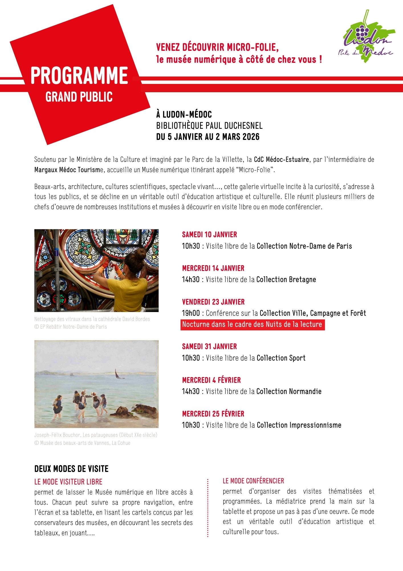 | La Micro-Folie à Ludon-Médoc Le mercredi 14 janvier 2026 Le vendredi 23 janvier 2026 Le mercredi 4 février 2026 Le mercredi 25 février 2026 33290 LUDON-MEDOC Tél : +33 5 56 00 65 15