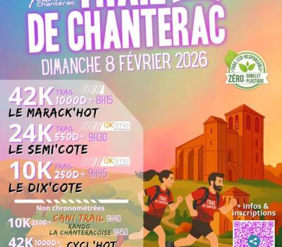 Les courses nature se dérouleront sur les communes de Chantérac, St-Jean d’Ataux, St-Germain du Salembre, Neuvic, Douzillac, St-Astier et St-Léon sur l'Isle (24). La randonnée se déroulera sur la commune de Chantérac (24190). Départ des courses (briefing 10 mn avant chaque épreuve) : - 8h : Cycl’Hot VTT (42 et 21 km), 10 € et 8 € - 8h15 : trail Le Marack’Hot* (42 km) - 9h30 : trail Le Semie’Côte* (21km) - 9h40 : Canitrail randonnée (10 km), 5 € - 9h45 : trail Le Dix’Côte* (10 km) - 9h50 : Randonnée La Chantéracoise (10 km), 6€ Dès 12h : récompenses Départ salle des fêtes de Chantérac (espace Cantarius) *Inscription préalable nécessaire pour les trails chronométrés : https://ok-time.fr/competition/trail-de-chanterac-2026 Activités non chronométrées : inscriptions sur place, accueil dès 7h Esprit Trail Chantérac 06 46 31 70 13 |