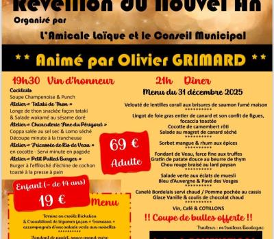 Réveillon du Nouvel An Organisé par l'Amicale laïque et le Conseil Municipal Animé par Olivier GRIMARD Enfants (- de 14 ans) 19€ Adulte 69€ |
