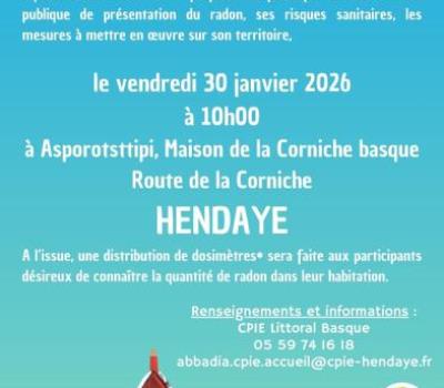 Mieux le connaître pour mieux s’en protéger. Le CPIE Littoral Basque, en partenariat avec l’ARS Nouvelle-Aquitaine et l’ASNR vous propose de participer à une réunion publique de présentation du radon : • Ses risques sanitaires, • Les mesures à mettre en œuvre sur son territoire, A l’issue, une distribution de dosimètres* sera faite aux participants désireux de connaître la quantité de radon dans leur habitation. |