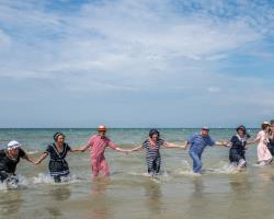 | C'est l'occasion d'assister ou de participer à l'incontournable dernier bain de mer costumé à Cabourg. Échauffements en musique sur la plage avec Manu, départ dans l'eau en fanfare, verre offert à la fin du bain : fous rires et frissons garantis ! Possibilité de location de costume de bain. |