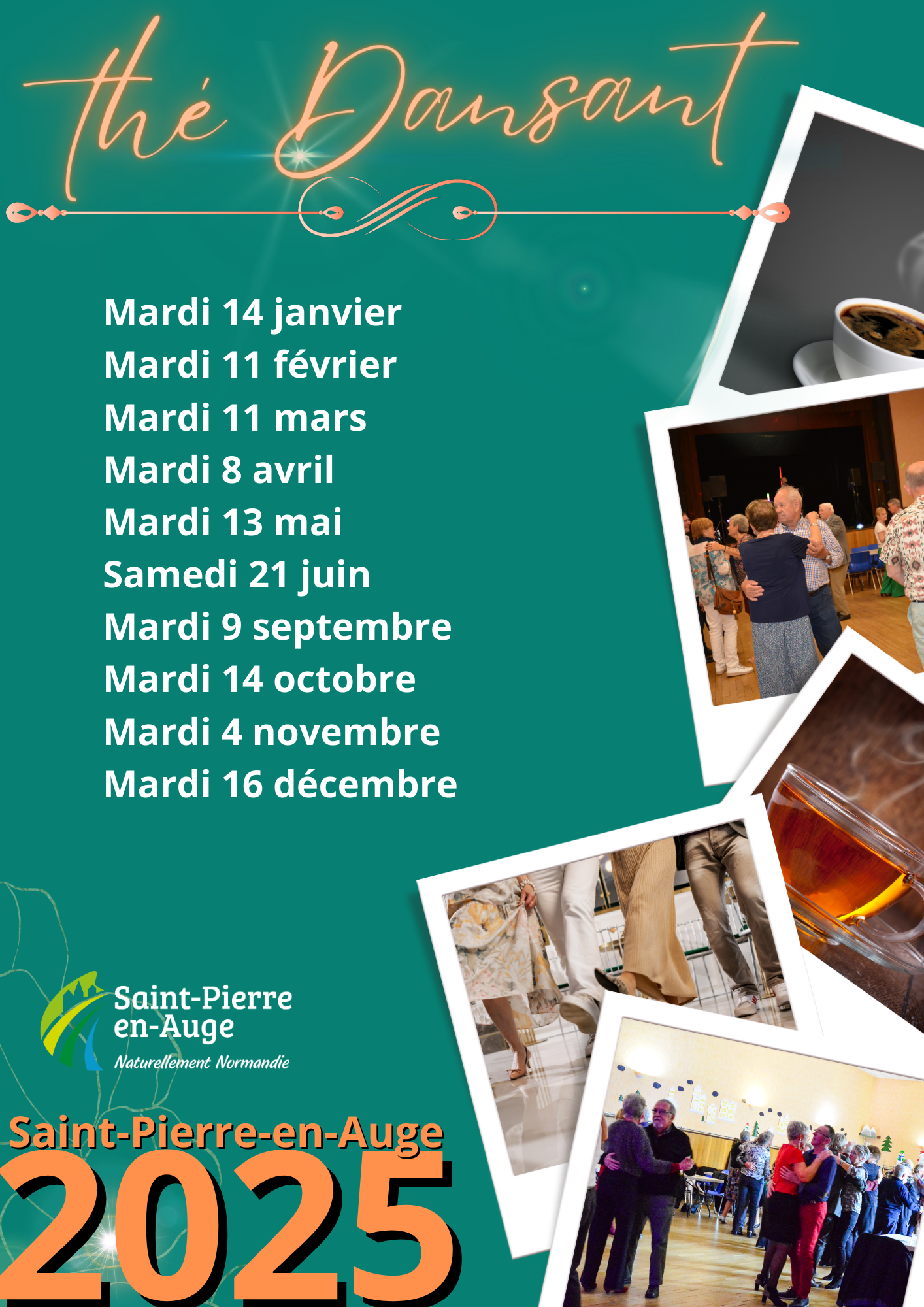 | Le thé dansant est le rendez-vous incontournable des amateurs de danse, le deuxième mardi après-midi du mois, de 14h30 à 19h à la salle des fêtes de Saint-Pierre-sur-Dives. Tarif : 13€ / personne comprenant l'entrée et un goûter. Sur inscription au 02.31.20.78.18 ou par mail à evenementiel@stpauge.fr. Agenda 2025 : 14 janvier, 11 février, 11 mars, 8 avril, 13 mai, 10 juin, 9 septembre, 14 octobre, 4 novembre et 16 décembre. |