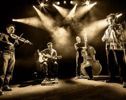 | 1ère partie – La Funfare Vincent DESGRIPPES – Direction Simon LETERRIER – Guitare, Pieds Jacky BEAUCE – Uilleann Pipe, Flûtes irlandaises, Violon, Chœurs Olivier LONG – Violon, Pieds, Chœurs Josselin CHERI – Contrebasse, Chœurs Cette formation acoustique propose des arrangements et compositions originales, tout en restant fidèle aux sonorités et rythmes de la musique traditionnelle. Les musiciens, issus de groupes emblématiques de la scène traditionnelle régionale et nationale (Mes Souliers sont Rouges, Le Diabl’ dans la Fourche…), puisent leur inspiration dans les musiques québécoises, irlandaises et bretonnes. Leurs arrangements dynamiques et inventifs s’appuient sur une grande richesse instrumentale, des harmonies vocales soignées et la podorythmie (percussions des pieds typiques de la musique folk). Le tout donne naissance à un spectacle à la fois explosif et émouvant, où énergie, authenticité et émotion se mêlent avec brio. |