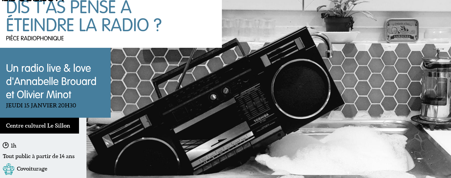| Et c’est pour qui ? "Pour qui aime surfer sur les ondes, se rappeler aux émissions ou chansons qui ont fait l’histoire radiophonique. » - Tout public dès 14 ans. Parfois, il suffit juste d'allumer le poste et on se fait des films. Parfois, il suffit juste de fabriquer des sons ensemble et on chavire. Parfois, la fin d'une émission sonne comme une rupture. Comment se tisse ce fil invisible ? Qu'est-ce qui se noue entre les oreilles de l'auditeurice et les voix derrière le micro ? Entre histoires d'amour naissantes, passées ou imaginaires, on se laisse toucher par les ondes. Mais la radio a-t-elle encore le mojo ? A l'heure où l'audience globale baisse, où le service public la désinvestit, où les antennes privées deviennent des joujoux pour milliardaires, et où il est de bon ton de programmer la mise à la retraite de la FM, quel amour nous lie encore au transistor ? Peut-on plaquer la radio pour le podcast ? Trouve-t-on réellement des partenaires durables sur le site AdopteUnMike ? Et sinon, vous êtes plutôt Nicolas Demorand sur France Inter ou Guillaume Erner sur France Culture ? Bruno Guillon sur Fun ou Difool sur Skyrock ? Radio Canut ou Radio Bonheur ? Et mon montage ? Tu l'aimes mon montage ? Autant de questions sensibles et existentielles auxquelles vous trouverez peut-être des réponses, grâce à ce radio live&love ! Sur scène, un dispositif simple : deux micros, deux ordis, une console et deux voix rythmées par une horloge de studio et la gestuelle d'un direct radio. A partir d'archives, de micros-trottoirs, de récits, de parodies, de documentaires, de musiques et de quizz sonores, deux amoureu·se·s de la radio dialoguent pour raconter des histoires d'amour à la radio, dans la radio et sur la radio... |