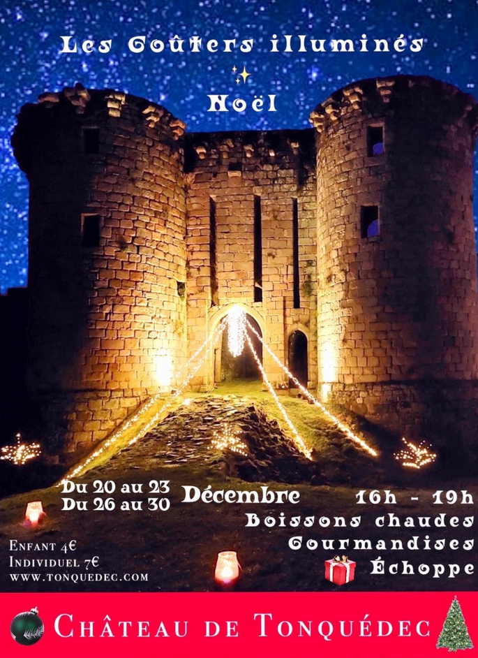 | Pour la première fois, en 2025 le Château de Tonquédec ouvre ses portes aux Visiteurs autour de Noël ! Venez découvrir le Château illuminé à la tombée de la nuit, savourez un bon goûter à la Buvette et profitez de la jolie sélection de l’Échoppe pour vos derniers cadeaux. |