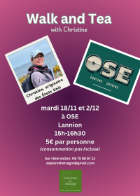 | On échange en anglais en se baladant dans le rues de Lannion et autour du Léguer. Ensuite on se réchauffe et on continue la conversation avec une boisson chaude (et pourquoi pas un gâteau ?) à OSE. Réservations obligatoires. |