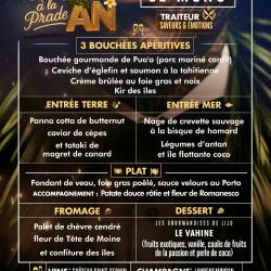 - Spectacle de la troupe Heiva Tahiti - Animation DJ Dr Funk jusqu’au bout de la nuit - Dîner de fête préparé par le traiteur Saveurs & Émotions Au menu : Apéritif - Bouchée de porc mariné confit (Pua’a) - Ceviche d’églefin et saumon à la tahitienne - Crème brûlée au foie gras et noix - Kir des îles Entrées - Terre : Panna cotta de butternut, caviar de cèpes, tataki de magret de canard - Mer : Nage de crevette sauvage à la bisque de homard, légumes d’antan, île flottante coco Plat principal - Fondant de veau, foie gras poêlé, sauce velours au Porto - Accompagnement : patate douce rôtie et fleur de Romanesco Fromage - Palet de chèvre cendré, fleur de Tête de Moine, confiture des îles Dessert - Le Vahine : fruits exotiques, vanille, coulis de fruits de la passion, perle de coco (par Les Gourmandises de Lilu) Boissons - Vins : blanc, rouge (Château Saint-Sernin) - Champagne : Laurent Mougin (Blanc, rouge et champagne : 1 bouteille pour 6 personnes) Infos et réservations par téléphone. Général : 99,00 € |