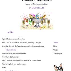 Menu et service du traiteur La Chartreuse. MENU Apéritif et ses amuse-bouches Foie Gras de canard du sud-ouest, chutney à la figue Coquille de Noix de Saint Jacques et fondue de poireaux Trou normand Noix de Veau pâtissière braisée Garniture de légumes Duo Cantal et Saint Nectaire fermier et salade verte Vacherin glacé aux fruits rouges Café Soupe de fromage Vins Blanc Rouge Champagne Général : 98,00 € |
