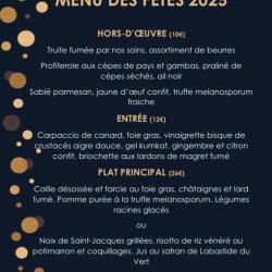 HORS-D’ŒUVRE • Truite fumée par nos soins, assortiment de beurres • Profiterole aux cèpes de pays et gambas, praliné de cèpes séchés, ail noir • Sablé parmesan, jaune d’œuf confit, truffe melanosporum fraîche ENTRÉE • Carpaccio de canard, foie gras, vinaigrette bisque de crustacés aigre douce, gel kumkat, gingembre et citron confit, briochette aux lardons de magret fumé PLAT PRINCIPAL • Caille désossée et farcie au foie gras, châtaignes et lard fumé. Pomme purée à la truffe melanosporum. Légumes racines glacés ou • Noix de Saint-Jacques grillées, risotto de riz vénéré au potimarron et coquillages. Jus au safran de Labastide du Vert DESSERT • Poire et chocolat différentes textures, tonka et amandes Général : 10,00 € HORS-D’ŒUVRE Général : 12,00 € ENTRÉE Général : 26,00 € PLAT PRINCIPAL Général : 7,00 € DESSERT |