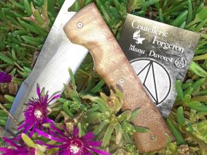 Emmanuel Davoust fabrique des couteaux pliables dans leur globalité (lames et manches). Il propose actuellement 3 types de couteaux: le Léon, le Mada et le Suzain, plus petit. Il fabrique aussi selon la demande du client. Tarif-couteau: entre 100 et 300 €. Pour le manche des couteaux, il utilise du bois de noyer ou de buis mais aussi des os ou cornes d'animaux. Vente sur demande