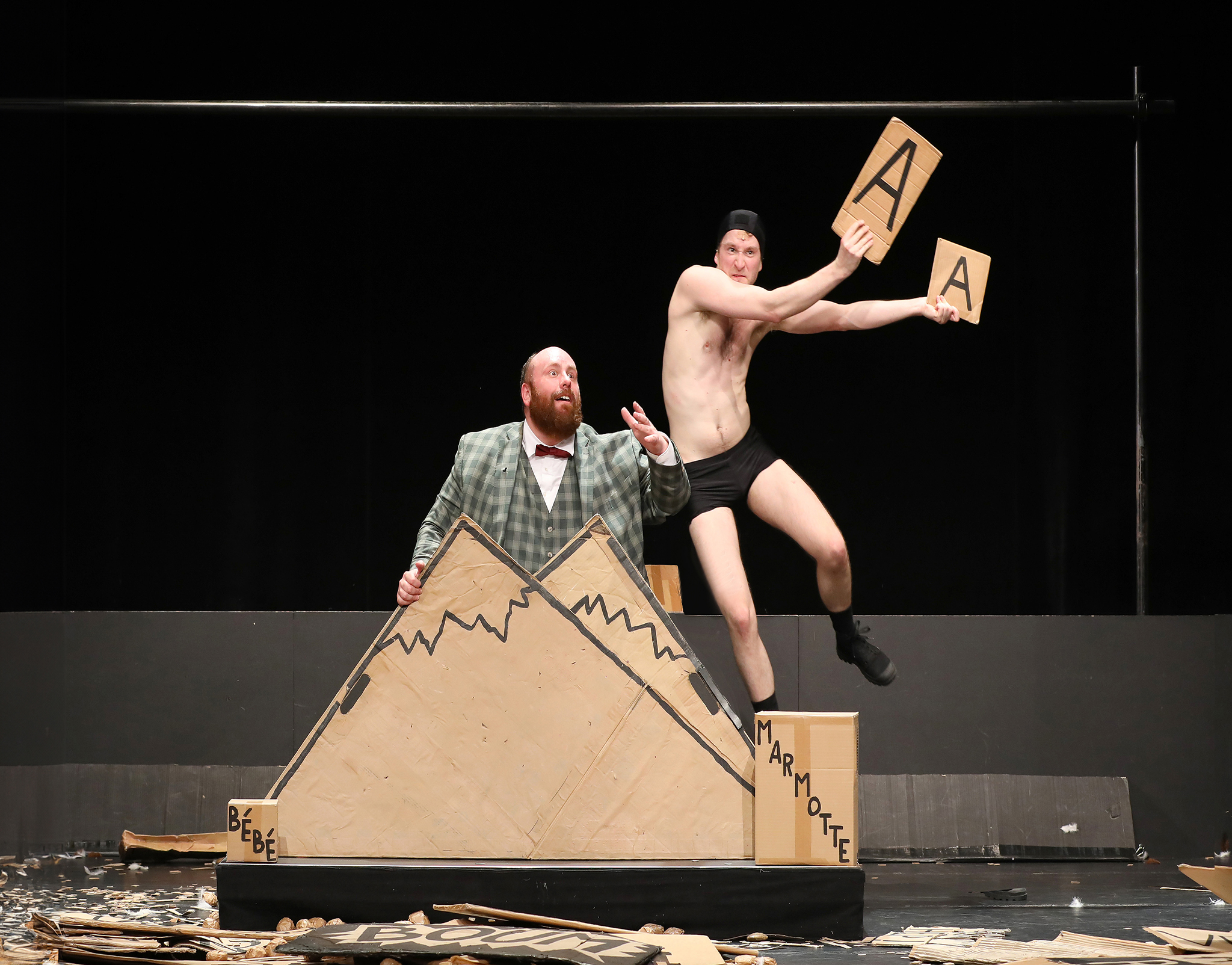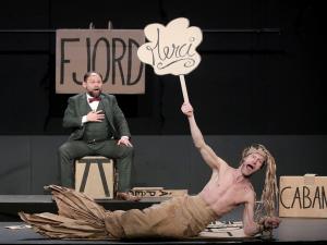 Un homme en costume trois pièces quitte les plaines glacées du Grand Nord pour une odyssée déjantée. Il tombe amoureux d’une sirène, survole les continents en avion, glisse en patins et file en trottinette dans une aventure rocambolesque inoubliable. Le twist ? L’acteur principal, impassible, reste assis tout du long… pendant que son acolyte en maillot de bain s’agite frénétiquement autour de lui avec des centaines de morceaux de carton pour faire vivre paysages, personnages et créatures délirantes, dans un feu d’artifice visuel et burlesque.