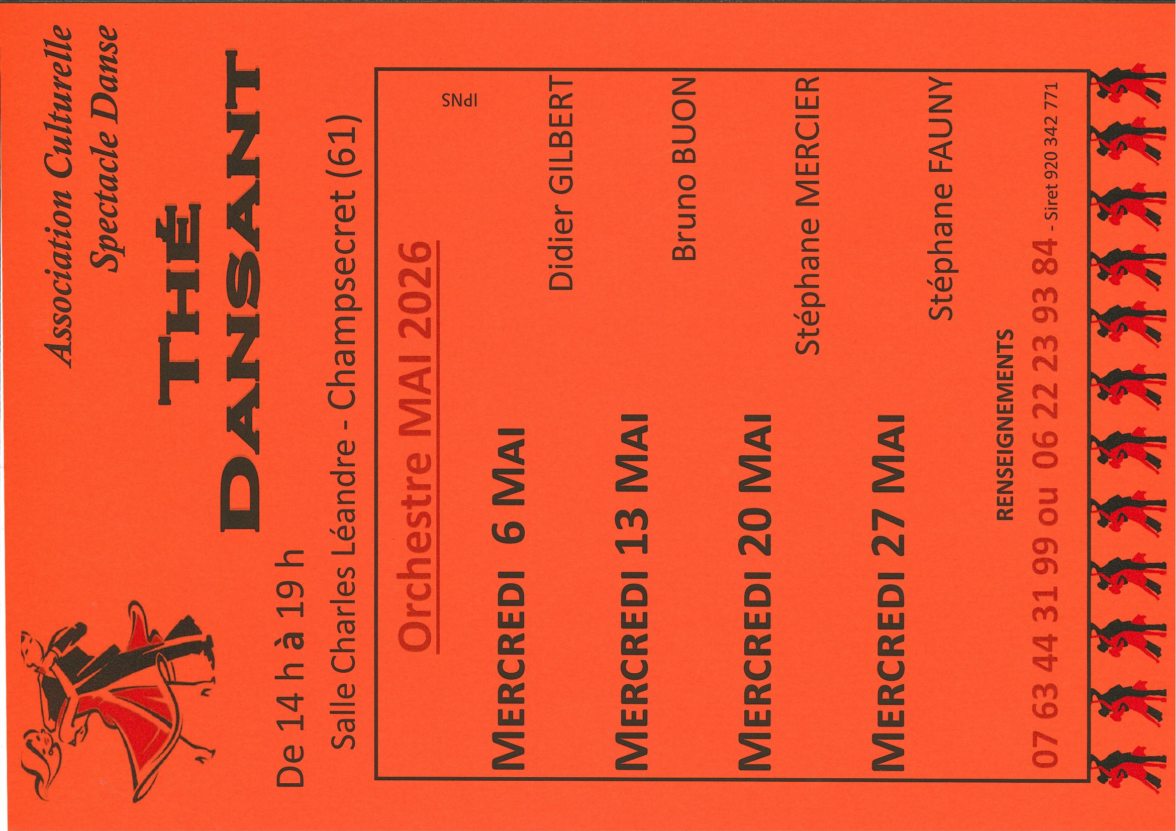 L'entrée coûte 10€ par personne et comprend l'entrée, une boisson chaude et un pain au chocolat. Sur place, il est possible d'acheter de la boisson pour se désaltérer. Le thé dansant démarre à 14h et se termine à 19h. Le programme des orchestres : En Mai : - Mercredi 6 mai : Didier Gilbert - Mercredi 13 mai : Bruno Buon - Mercredi 20 mai : Stéphane Mercier - Mercredi 27 mai : Stéphane Fauny Tarif de base : 10,00€ |