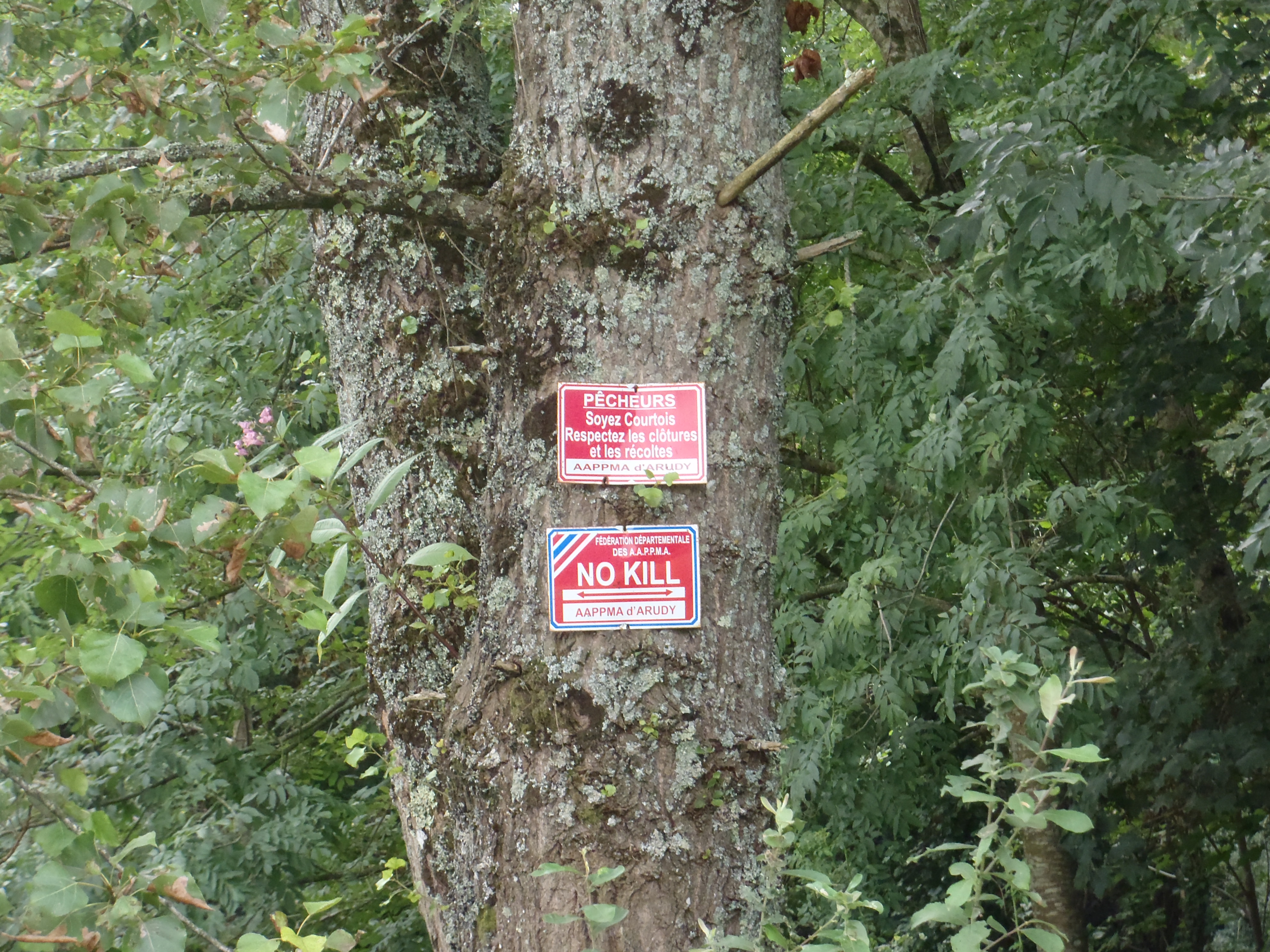 Règlement : Parcours no-kill : Remettre le poisson pris dans son milieu naturel avec les précautions d'usage. La pratique du no-kill se fait au moyen de deux hameçons ou trois mouches artificielles au plus. Les hameçons autorisés sont des hameçons simples sans ardillon ou ardillons écrasés de façon à en faire disparaître la fonction.