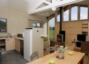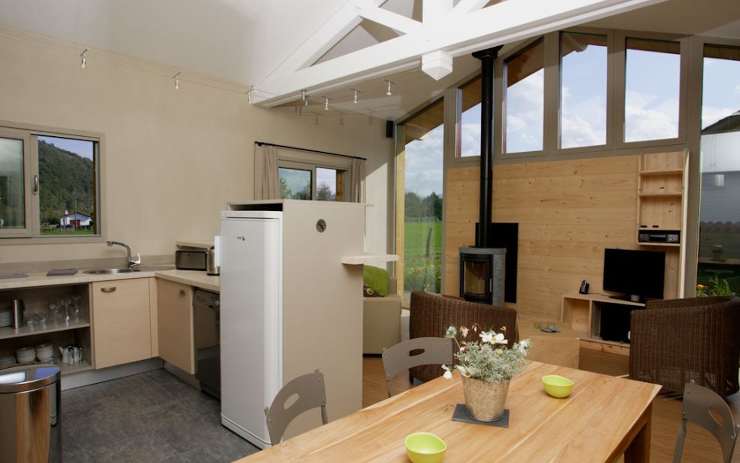 Espace cuisine équipé (l-vaisselle) ouvert sur le séjour où le poêle (bois de chauffage fourni) y trouve toute sa place au milieu du salon (TV, DVD, hifi, wifi, canapé...).