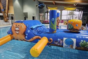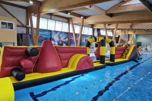 Joignez vous à nous pour des défis et des moments de divertissement en famille ou entre amis sur notre énorme structure gonflable installée dans le grand bassin.